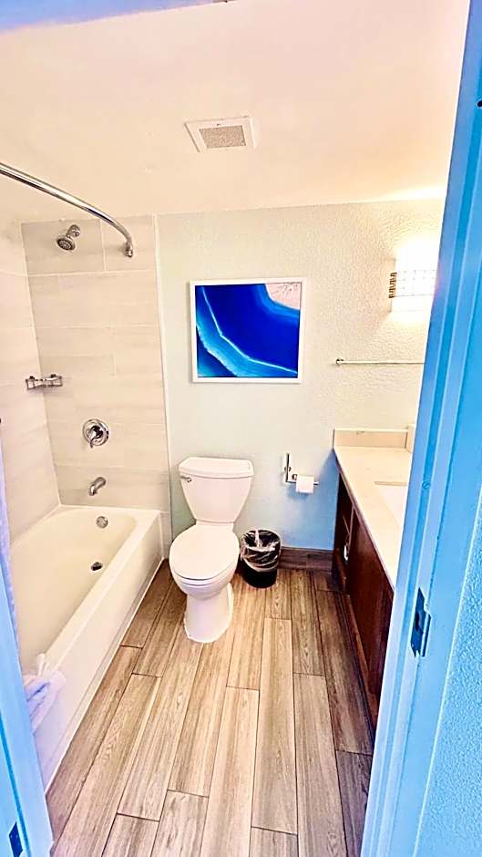 This room features a bath tub, cable TV, and microwave. A small refrigerator is also included.